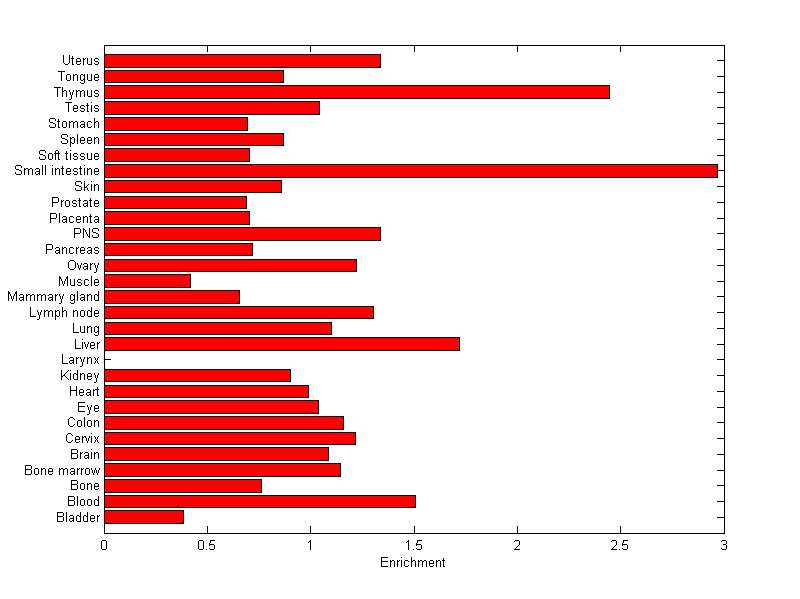 The expression level is normalized with tissue-library size. Each value for a gene in a tissue is a ratio of observed ESTs to the expected one in this tissue. The expected number of ESTs is the product of total ESTs of the gene and the fraction of total ESTs in the tissue among all ESTs in 30 tissues.