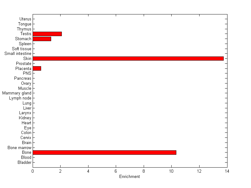 The expression level is normalized with tissue-library size. Each value for a gene in a tissue is a ratio of observed ESTs to the expected one in this tissue. The expected number of ESTs is the product of total ESTs of the gene and the fraction of total ESTs in the tissue among all ESTs in 30 tissues.