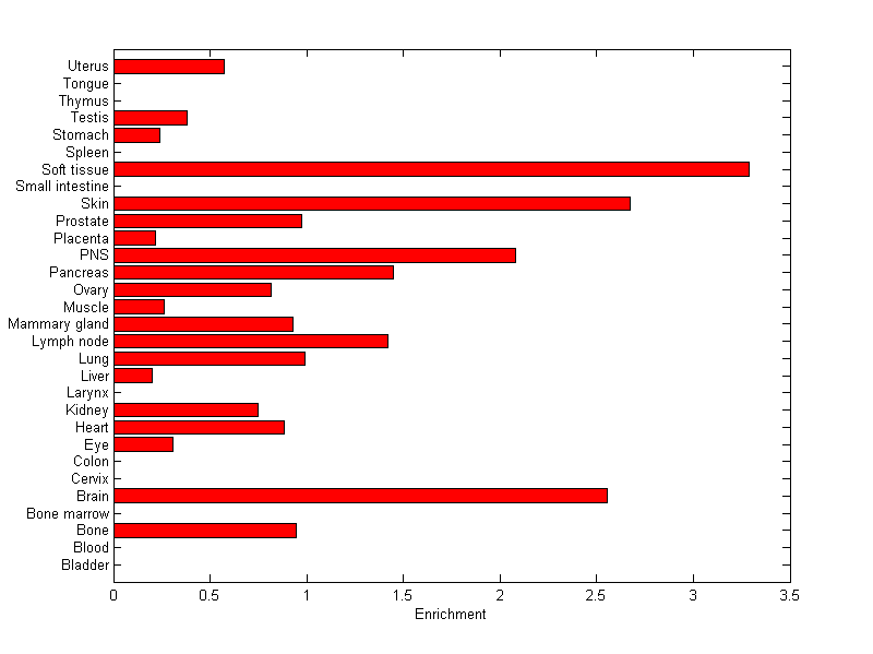 The expression level is normalized with tissue-library size. Each value for a gene in a tissue is a ratio of observed ESTs to the expected one in this tissue. The expected number of ESTs is the product of total ESTs of the gene and the fraction of total ESTs in the tissue among all ESTs in 30 tissues.