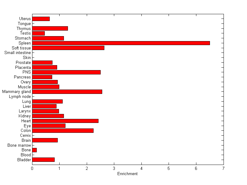 The expression level is normalized with tissue-library size. Each value for a gene in a tissue is a ratio of observed ESTs to the expected one in this tissue. The expected number of ESTs is the product of total ESTs of the gene and the fraction of total ESTs in the tissue among all ESTs in 30 tissues.