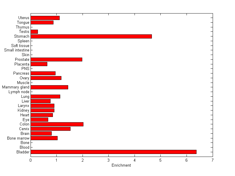 The expression level is normalized with tissue-library size. Each value for a gene in a tissue is a ratio of observed ESTs to the expected one in this tissue. The expected number of ESTs is the product of total ESTs of the gene and the fraction of total ESTs in the tissue among all ESTs in 30 tissues.