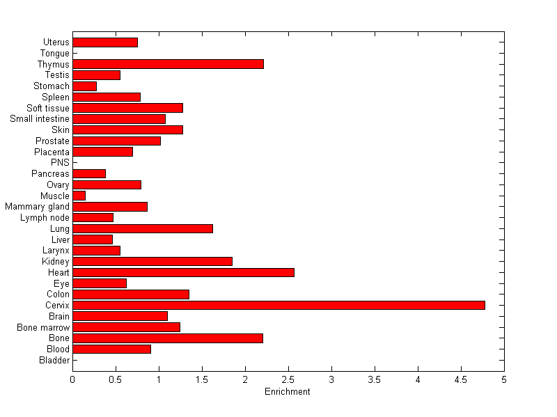 The expression level is normalized with tissue-library size. Each value for a gene in a tissue is a ratio of observed ESTs to the expected one in this tissue. The expected number of ESTs is the product of total ESTs of the gene and the fraction of total ESTs in the tissue among all ESTs in 30 tissues.