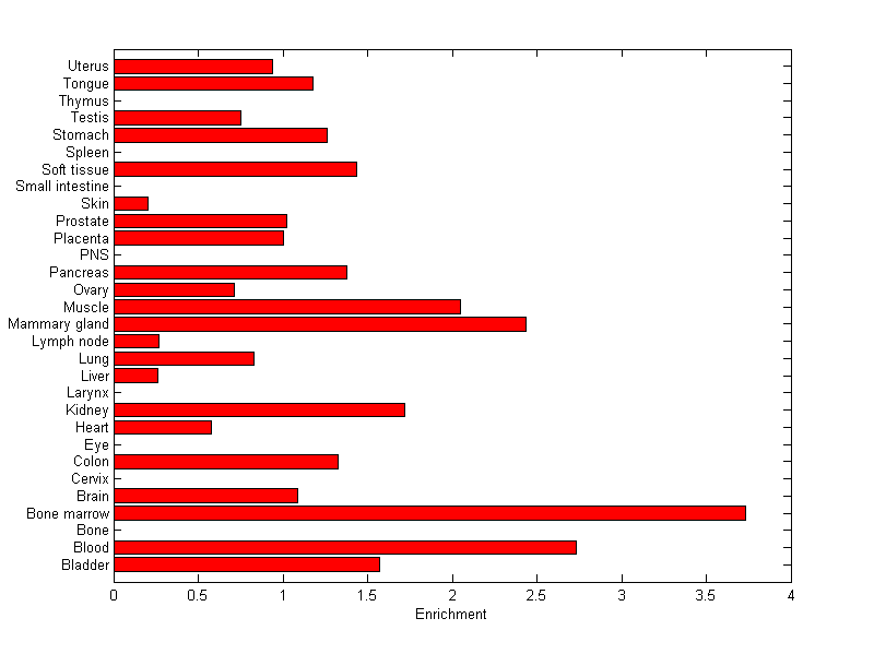 The expression level is normalized with tissue-library size. Each value for a gene in a tissue is a ratio of observed ESTs to the expected one in this tissue. The expected number of ESTs is the product of total ESTs of the gene and the fraction of total ESTs in the tissue among all ESTs in 30 tissues.