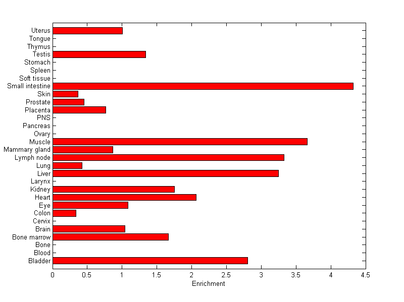 The expression level is normalized with tissue-library size. Each value for a gene in a tissue is a ratio of observed ESTs to the expected one in this tissue. The expected number of ESTs is the product of total ESTs of the gene and the fraction of total ESTs in the tissue among all ESTs in 30 tissues.