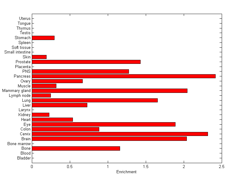 The expression level is normalized with tissue-library size. Each value for a gene in a tissue is a ratio of observed ESTs to the expected one in this tissue. The expected number of ESTs is the product of total ESTs of the gene and the fraction of total ESTs in the tissue among all ESTs in 30 tissues.