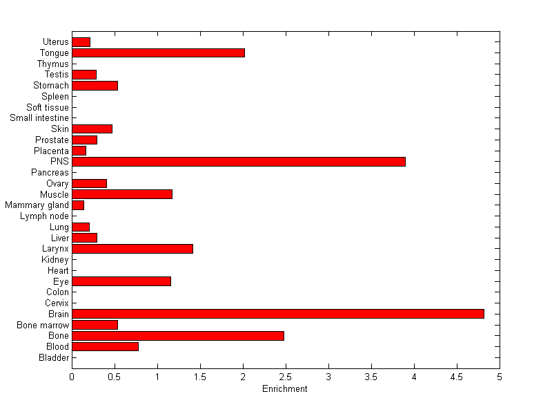 The expression level is normalized with tissue-library size. Each value for a gene in a tissue is a ratio of observed ESTs to the expected one in this tissue. The expected number of ESTs is the product of total ESTs of the gene and the fraction of total ESTs in the tissue among all ESTs in 30 tissues.