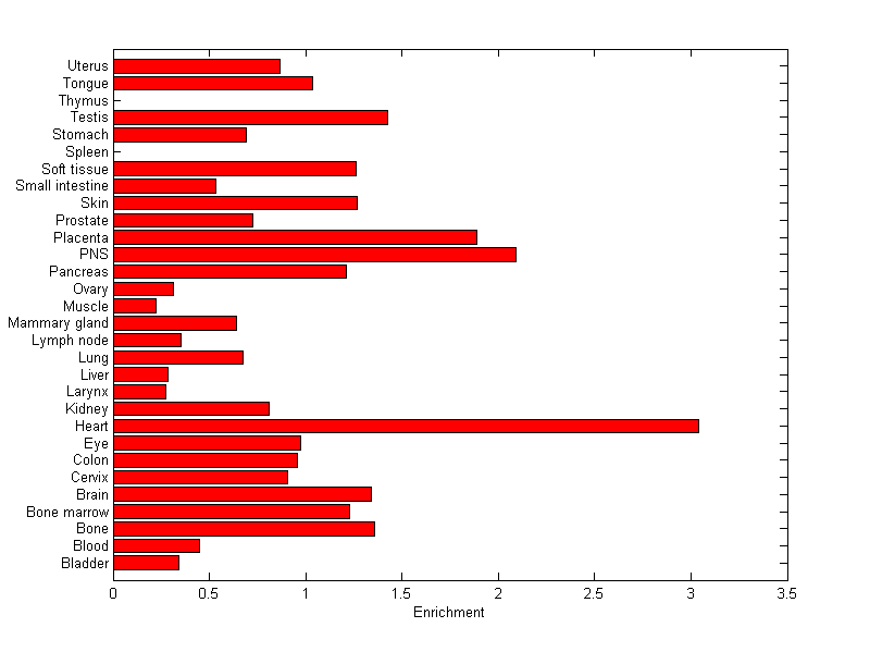 The expression level is normalized with tissue-library size. Each value for a gene in a tissue is a ratio of observed ESTs to the expected one in this tissue. The expected number of ESTs is the product of total ESTs of the gene and the fraction of total ESTs in the tissue among all ESTs in 30 tissues.