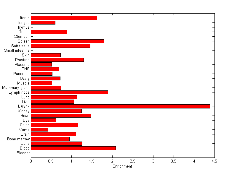 The expression level is normalized with tissue-library size. Each value for a gene in a tissue is a ratio of observed ESTs to the expected one in this tissue. The expected number of ESTs is the product of total ESTs of the gene and the fraction of total ESTs in the tissue among all ESTs in 30 tissues.