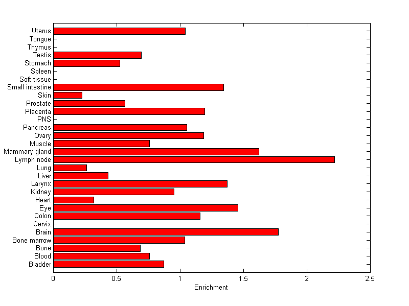 The expression level is normalized with tissue-library size. Each value for a gene in a tissue is a ratio of observed ESTs to the expected one in this tissue. The expected number of ESTs is the product of total ESTs of the gene and the fraction of total ESTs in the tissue among all ESTs in 30 tissues.