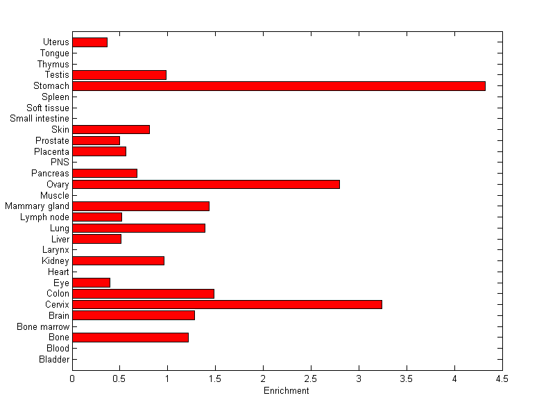 The expression level is normalized with tissue-library size. Each value for a gene in a tissue is a ratio of observed ESTs to the expected one in this tissue. The expected number of ESTs is the product of total ESTs of the gene and the fraction of total ESTs in the tissue among all ESTs in 30 tissues.