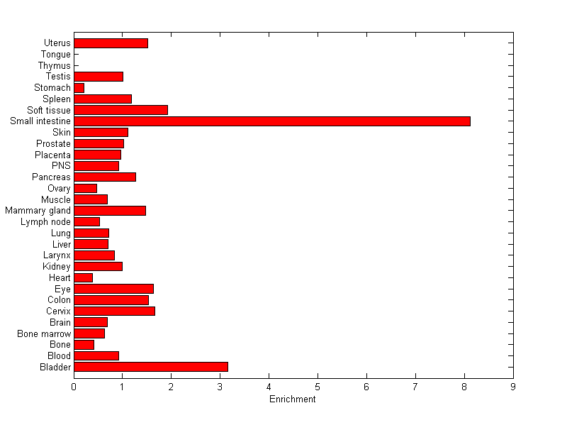 The expression level is normalized with tissue-library size. Each value for a gene in a tissue is a ratio of observed ESTs to the expected one in this tissue. The expected number of ESTs is the product of total ESTs of the gene and the fraction of total ESTs in the tissue among all ESTs in 30 tissues.