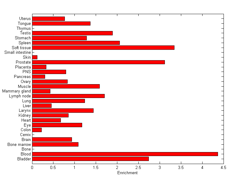 The expression level is normalized with tissue-library size. Each value for a gene in a tissue is a ratio of observed ESTs to the expected one in this tissue. The expected number of ESTs is the product of total ESTs of the gene and the fraction of total ESTs in the tissue among all ESTs in 30 tissues.
