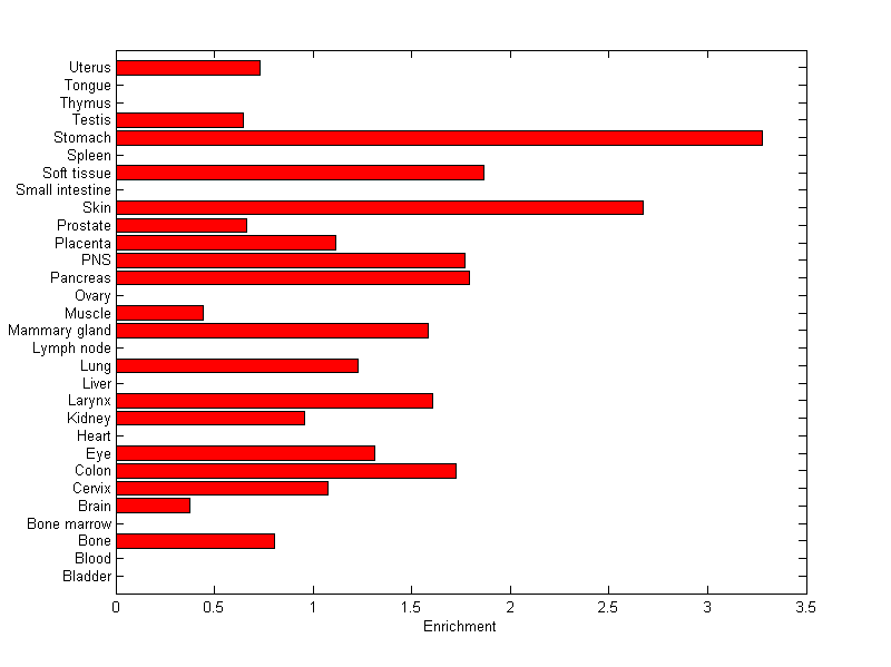 The expression level is normalized with tissue-library size. Each value for a gene in a tissue is a ratio of observed ESTs to the expected one in this tissue. The expected number of ESTs is the product of total ESTs of the gene and the fraction of total ESTs in the tissue among all ESTs in 30 tissues.