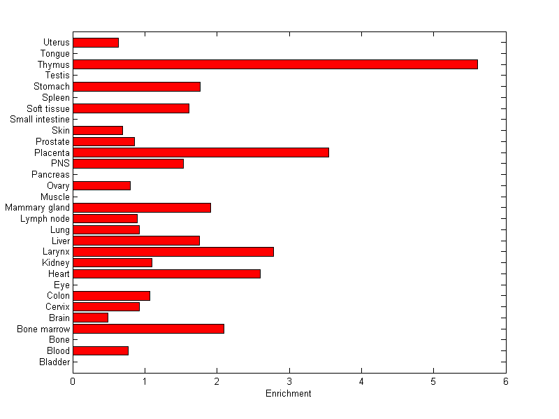 The expression level is normalized with tissue-library size. Each value for a gene in a tissue is a ratio of observed ESTs to the expected one in this tissue. The expected number of ESTs is the product of total ESTs of the gene and the fraction of total ESTs in the tissue among all ESTs in 30 tissues.