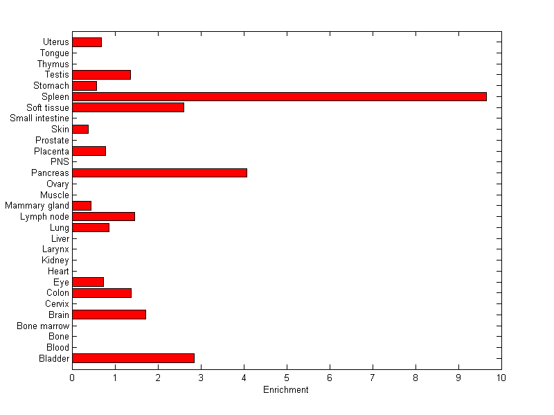 The expression level is normalized with tissue-library size. Each value for a gene in a tissue is a ratio of observed ESTs to the expected one in this tissue. The expected number of ESTs is the product of total ESTs of the gene and the fraction of total ESTs in the tissue among all ESTs in 30 tissues.