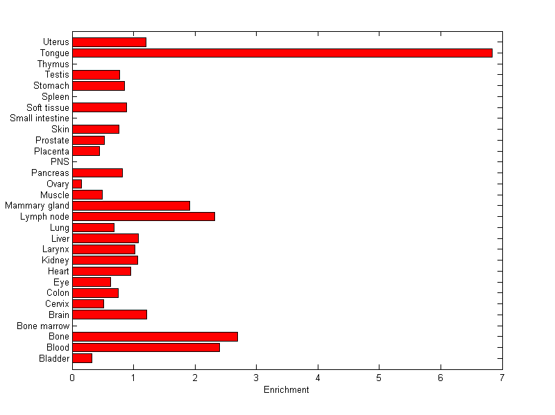 The expression level is normalized with tissue-library size. Each value for a gene in a tissue is a ratio of observed ESTs to the expected one in this tissue. The expected number of ESTs is the product of total ESTs of the gene and the fraction of total ESTs in the tissue among all ESTs in 30 tissues.