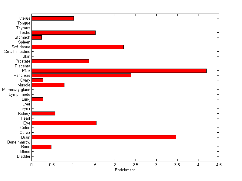 The expression level is normalized with tissue-library size. Each value for a gene in a tissue is a ratio of observed ESTs to the expected one in this tissue. The expected number of ESTs is the product of total ESTs of the gene and the fraction of total ESTs in the tissue among all ESTs in 30 tissues.