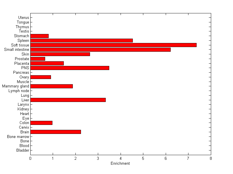 The expression level is normalized with tissue-library size. Each value for a gene in a tissue is a ratio of observed ESTs to the expected one in this tissue. The expected number of ESTs is the product of total ESTs of the gene and the fraction of total ESTs in the tissue among all ESTs in 30 tissues.