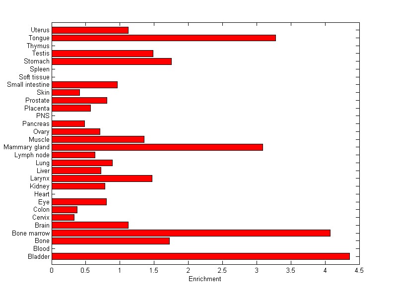 The expression level is normalized with tissue-library size. Each value for a gene in a tissue is a ratio of observed ESTs to the expected one in this tissue. The expected number of ESTs is the product of total ESTs of the gene and the fraction of total ESTs in the tissue among all ESTs in 30 tissues.