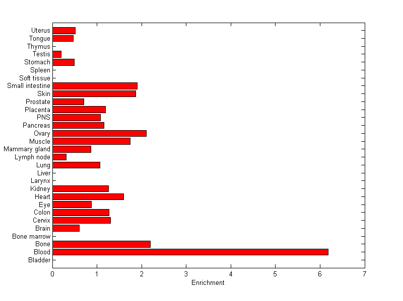 The expression level is normalized with tissue-library size. Each value for a gene in a tissue is a ratio of observed ESTs to the expected one in this tissue. The expected number of ESTs is the product of total ESTs of the gene and the fraction of total ESTs in the tissue among all ESTs in 30 tissues.