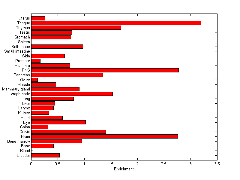 The expression level is normalized with tissue-library size. Each value for a gene in a tissue is a ratio of observed ESTs to the expected one in this tissue. The expected number of ESTs is the product of total ESTs of the gene and the fraction of total ESTs in the tissue among all ESTs in 30 tissues.