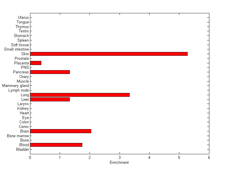 The expression level is normalized with tissue-library size. Each value for a gene in a tissue is a ratio of observed ESTs to the expected one in this tissue. The expected number of ESTs is the product of total ESTs of the gene and the fraction of total ESTs in the tissue among all ESTs in 30 tissues.