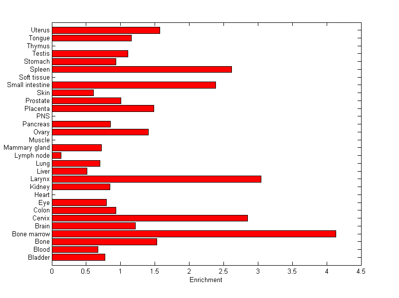 The expression level is normalized with tissue-library size. Each value for a gene in a tissue is a ratio of observed ESTs to the expected one in this tissue. The expected number of ESTs is the product of total ESTs of the gene and the fraction of total ESTs in the tissue among all ESTs in 30 tissues.