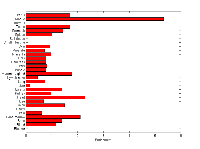 The expression level is normalized with tissue-library size. Each value for a gene in a tissue is a ratio of observed ESTs to the expected one in this tissue. The expected number of ESTs is the product of total ESTs of the gene and the fraction of total ESTs in the tissue among all ESTs in 30 tissues.