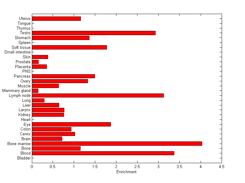 The expression level is normalized with tissue-library size. Each value for a gene in a tissue is a ratio of observed ESTs to the expected one in this tissue. The expected number of ESTs is the product of total ESTs of the gene and the fraction of total ESTs in the tissue among all ESTs in 30 tissues.