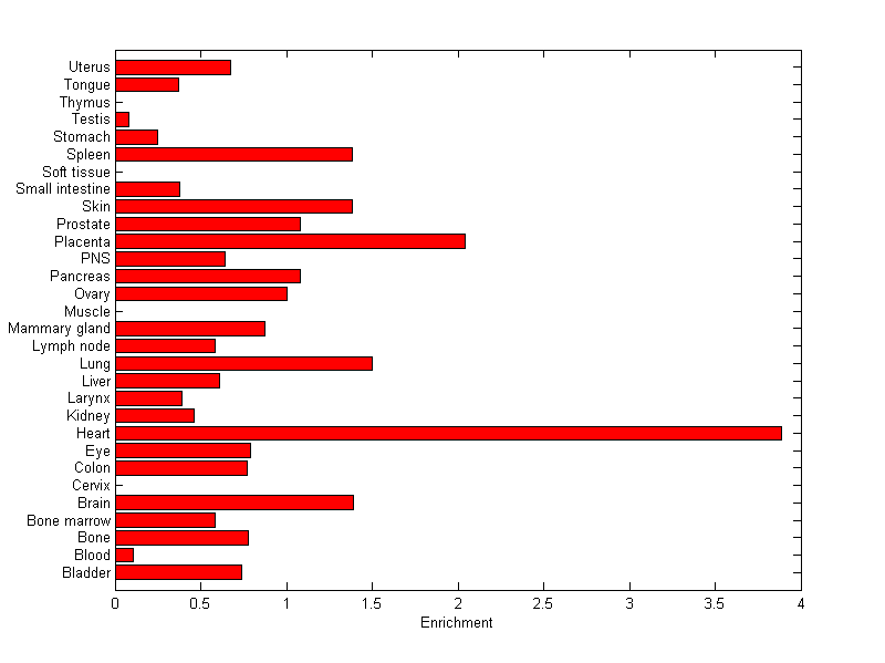 The expression level is normalized with tissue-library size. Each value for a gene in a tissue is a ratio of observed ESTs to the expected one in this tissue. The expected number of ESTs is the product of total ESTs of the gene and the fraction of total ESTs in the tissue among all ESTs in 30 tissues.