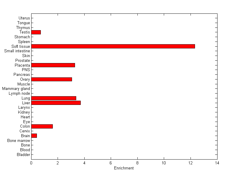 The expression level is normalized with tissue-library size. Each value for a gene in a tissue is a ratio of observed ESTs to the expected one in this tissue. The expected number of ESTs is the product of total ESTs of the gene and the fraction of total ESTs in the tissue among all ESTs in 30 tissues.
