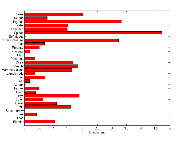 The expression level is normalized with tissue-library size. Each value for a gene in a tissue is a ratio of observed ESTs to the expected one in this tissue. The expected number of ESTs is the product of total ESTs of the gene and the fraction of total ESTs in the tissue among all ESTs in 30 tissues.