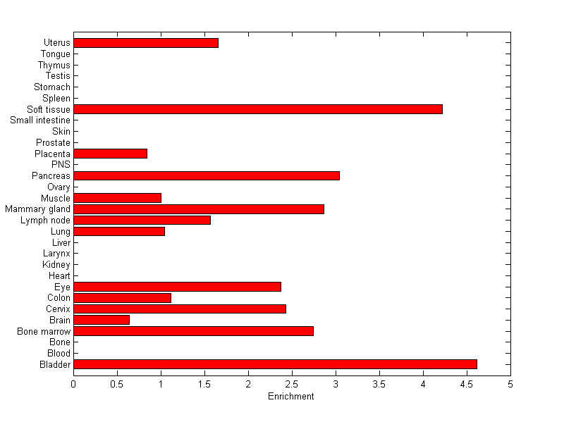 The expression level is normalized with tissue-library size. Each value for a gene in a tissue is a ratio of observed ESTs to the expected one in this tissue. The expected number of ESTs is the product of total ESTs of the gene and the fraction of total ESTs in the tissue among all ESTs in 30 tissues.