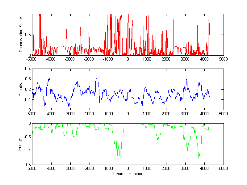 The energy profile (green curve) is about energy for module detection based on TF interaction. The positions with energy less than -1 indicate the existence of CRMs.