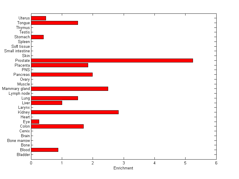 The expression level is normalized with tissue-library size. Each value for a gene in a tissue is a ratio of observed ESTs to the expected one in this tissue. The expected number of ESTs is the product of total ESTs of the gene and the fraction of total ESTs in the tissue among all ESTs in 30 tissues.