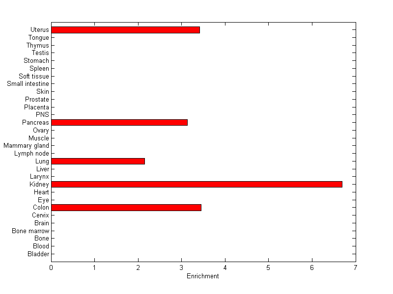 The expression level is normalized with tissue-library size. Each value for a gene in a tissue is a ratio of observed ESTs to the expected one in this tissue. The expected number of ESTs is the product of total ESTs of the gene and the fraction of total ESTs in the tissue among all ESTs in 30 tissues.