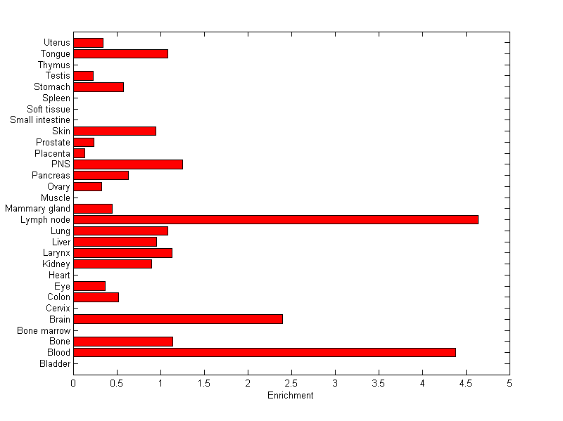 The expression level is normalized with tissue-library size. Each value for a gene in a tissue is a ratio of observed ESTs to the expected one in this tissue. The expected number of ESTs is the product of total ESTs of the gene and the fraction of total ESTs in the tissue among all ESTs in 30 tissues.