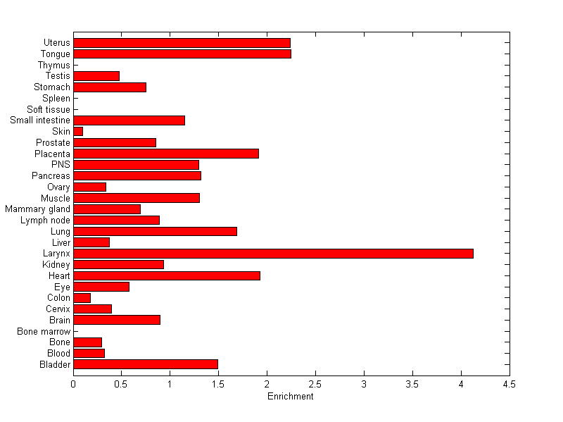 The expression level is normalized with tissue-library size. Each value for a gene in a tissue is a ratio of observed ESTs to the expected one in this tissue. The expected number of ESTs is the product of total ESTs of the gene and the fraction of total ESTs in the tissue among all ESTs in 30 tissues.