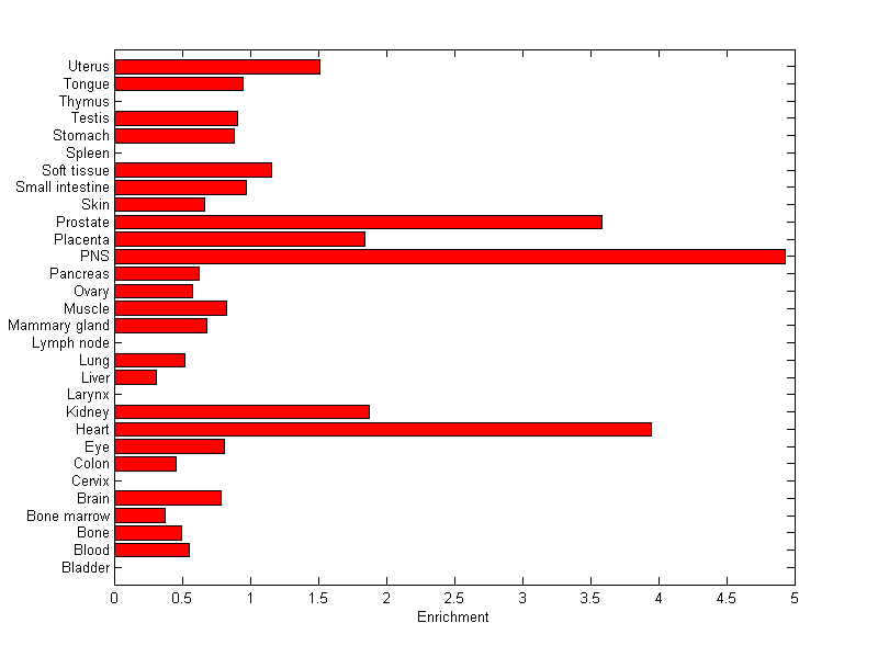 The expression level is normalized with tissue-library size. Each value for a gene in a tissue is a ratio of observed ESTs to the expected one in this tissue. The expected number of ESTs is the product of total ESTs of the gene and the fraction of total ESTs in the tissue among all ESTs in 30 tissues.