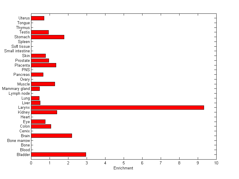 The expression level is normalized with tissue-library size. Each value for a gene in a tissue is a ratio of observed ESTs to the expected one in this tissue. The expected number of ESTs is the product of total ESTs of the gene and the fraction of total ESTs in the tissue among all ESTs in 30 tissues.
