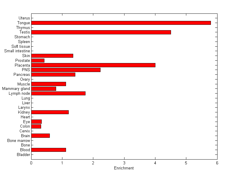 The expression level is normalized with tissue-library size. Each value for a gene in a tissue is a ratio of observed ESTs to the expected one in this tissue. The expected number of ESTs is the product of total ESTs of the gene and the fraction of total ESTs in the tissue among all ESTs in 30 tissues.