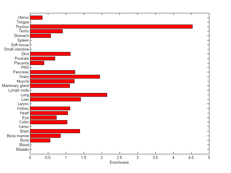 The expression level is normalized with tissue-library size. Each value for a gene in a tissue is a ratio of observed ESTs to the expected one in this tissue. The expected number of ESTs is the product of total ESTs of the gene and the fraction of total ESTs in the tissue among all ESTs in 30 tissues.