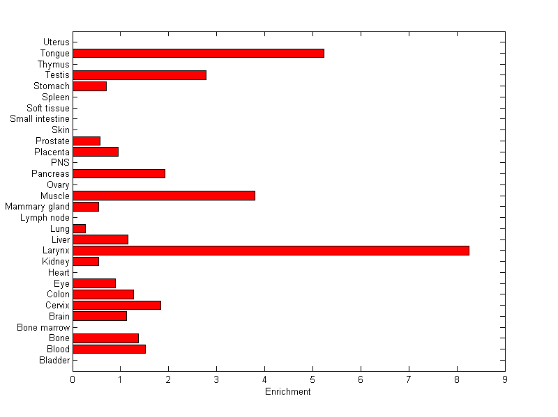 The expression level is normalized with tissue-library size. Each value for a gene in a tissue is a ratio of observed ESTs to the expected one in this tissue. The expected number of ESTs is the product of total ESTs of the gene and the fraction of total ESTs in the tissue among all ESTs in 30 tissues.