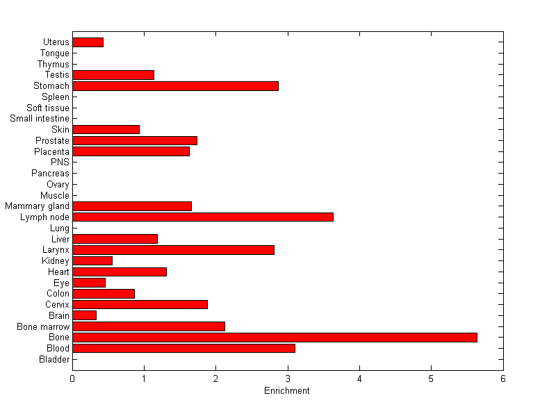 The expression level is normalized with tissue-library size. Each value for a gene in a tissue is a ratio of observed ESTs to the expected one in this tissue. The expected number of ESTs is the product of total ESTs of the gene and the fraction of total ESTs in the tissue among all ESTs in 30 tissues.