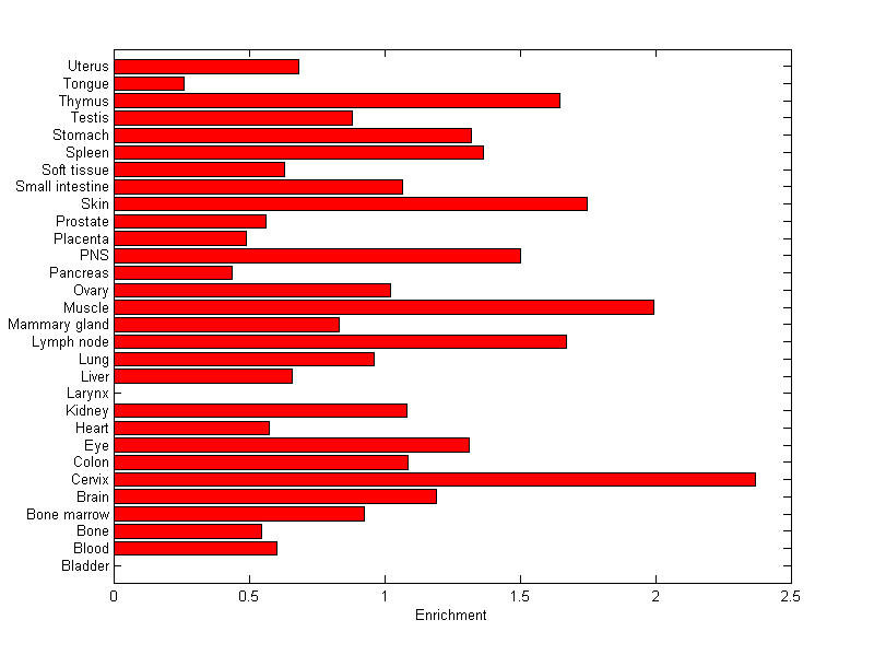 The expression level is normalized with tissue-library size. Each value for a gene in a tissue is a ratio of observed ESTs to the expected one in this tissue. The expected number of ESTs is the product of total ESTs of the gene and the fraction of total ESTs in the tissue among all ESTs in 30 tissues.