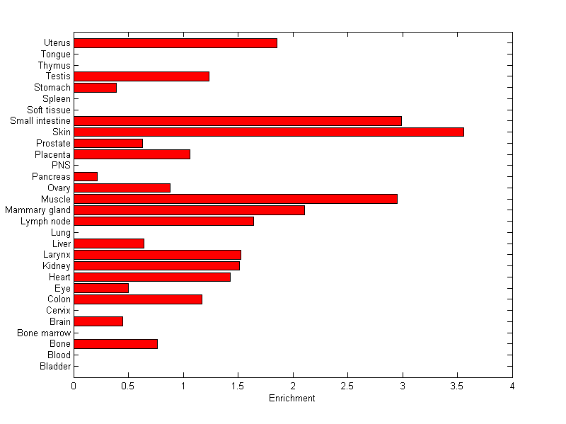 The expression level is normalized with tissue-library size. Each value for a gene in a tissue is a ratio of observed ESTs to the expected one in this tissue. The expected number of ESTs is the product of total ESTs of the gene and the fraction of total ESTs in the tissue among all ESTs in 30 tissues.