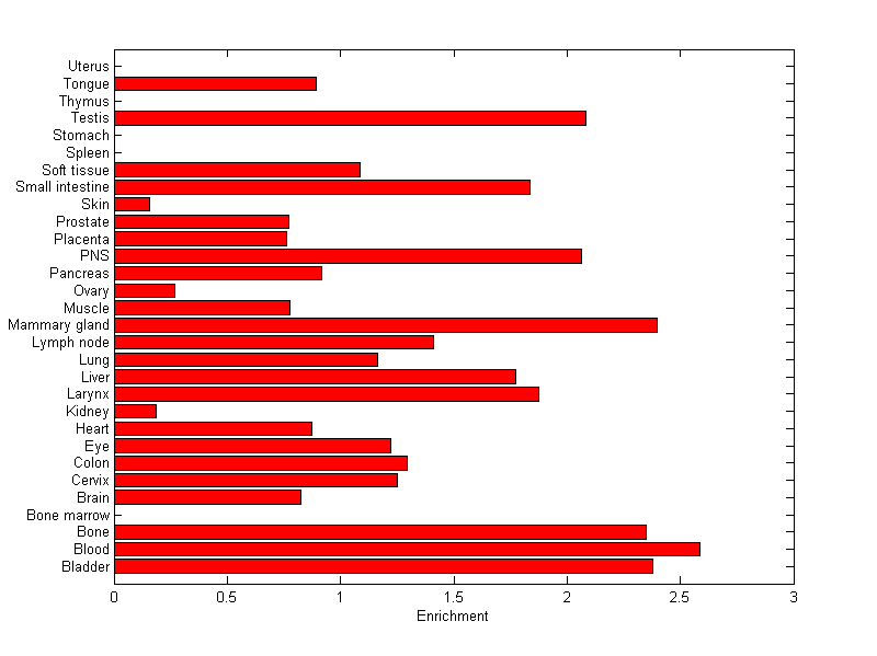 The expression level is normalized with tissue-library size. Each value for a gene in a tissue is a ratio of observed ESTs to the expected one in this tissue. The expected number of ESTs is the product of total ESTs of the gene and the fraction of total ESTs in the tissue among all ESTs in 30 tissues.