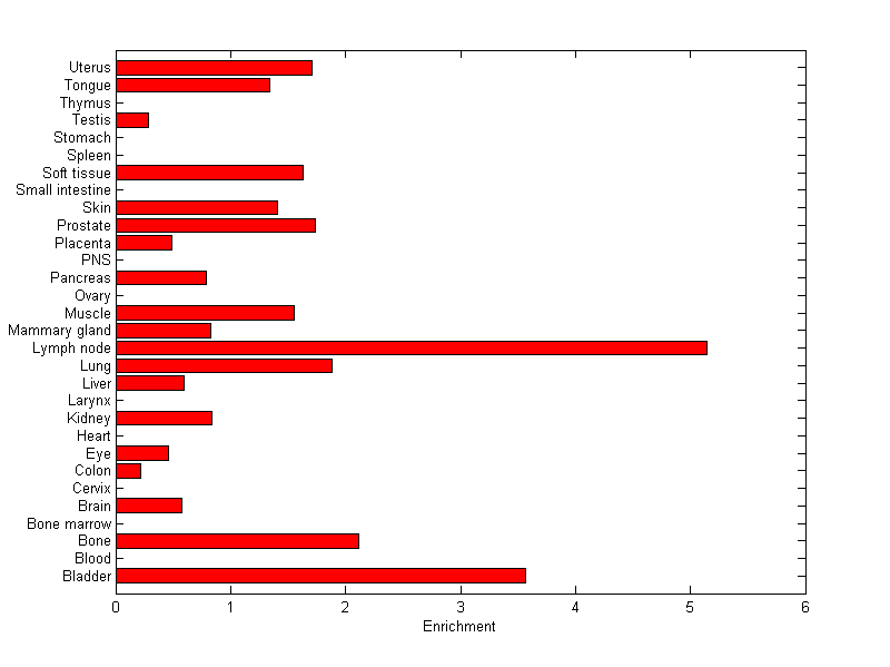 The expression level is normalized with tissue-library size. Each value for a gene in a tissue is a ratio of observed ESTs to the expected one in this tissue. The expected number of ESTs is the product of total ESTs of the gene and the fraction of total ESTs in the tissue among all ESTs in 30 tissues.