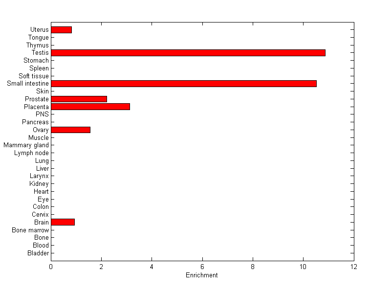 The expression level is normalized with tissue-library size. Each value for a gene in a tissue is a ratio of observed ESTs to the expected one in this tissue. The expected number of ESTs is the product of total ESTs of the gene and the fraction of total ESTs in the tissue among all ESTs in 30 tissues.
