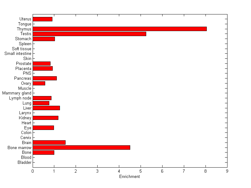 The expression level is normalized with tissue-library size. Each value for a gene in a tissue is a ratio of observed ESTs to the expected one in this tissue. The expected number of ESTs is the product of total ESTs of the gene and the fraction of total ESTs in the tissue among all ESTs in 30 tissues.